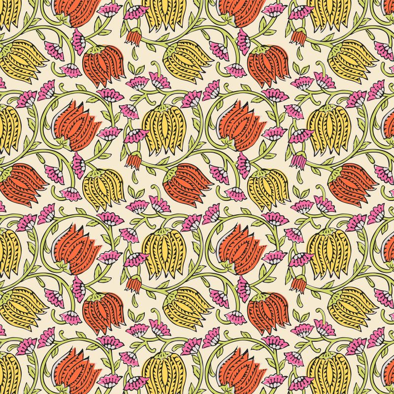Le tissu coton à motif fleurs effet block print Chaï est idéal pour toutes vos créations de couture. Son imprimé de belles fleurs effet block print sera parfait en vêtements, déco et accessoires. Disponible en 4 coloris ivoire/orange, rose, ivoire/bleu et bleu.