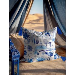 Laissez-vous séduire par ce nouvel imprimé tendance déco toile de jouy exotique Majorelle imprimé de palmiers, fontaine et patio en tissu toile 100% coton pour tous vos projets de couture, d'accessoires de décoration d'ameublement. Disponible en coloris encre.