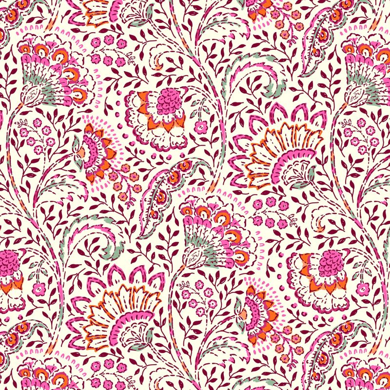Craquez pour le nouveau tissu à motif belles fleurs inspiration indienne effet block print, en 100% coton cretonne pour vos prochaines créations de vêtements, de décoration et d'accessoires. Il se décline en coloris rose.