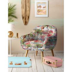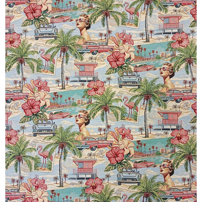 Nouveau tissu jacquard aux motifs palmiers, voitures anciennes, femmes, fleurs de Miami coloris multicolore est idéal pour la création d'accessoires, déco, et vêtements.